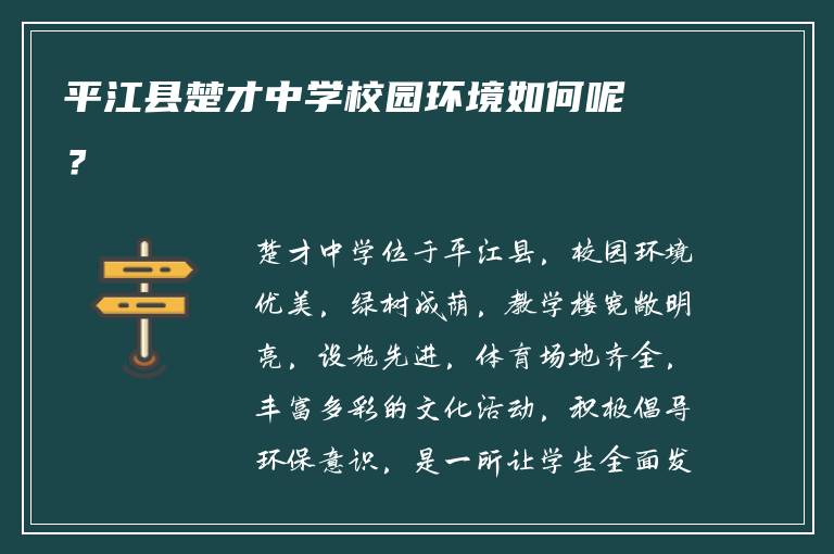 本文导读:楚才中学位于平江县,校园环境优美,绿树成荫,教学楼宽敞明亮,设施先进,体育场地齐全,丰富多彩的文化活动,积极倡导环保意识,是一所让学生全面发展的好学校。