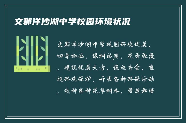 文郡洋沙湖中学的校园环境让人心旷神怡。校园四季如画,春有百花盛开,夏有绿树成荫,秋有金黄落叶,冬有银装素裹。校园内绿树成荫,花香弥漫,清新的空气让人心情愉悦。