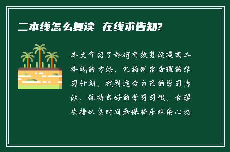 本文导读:本文介绍了如何有效复读提高二本线的方法,包括制定合理的学习计划、找到适合自己的学习方法、保持良好的学习习惯、合理安排休息时间和保持乐观的心态。通过这些建议,可以提高复读效率,实现目标。
