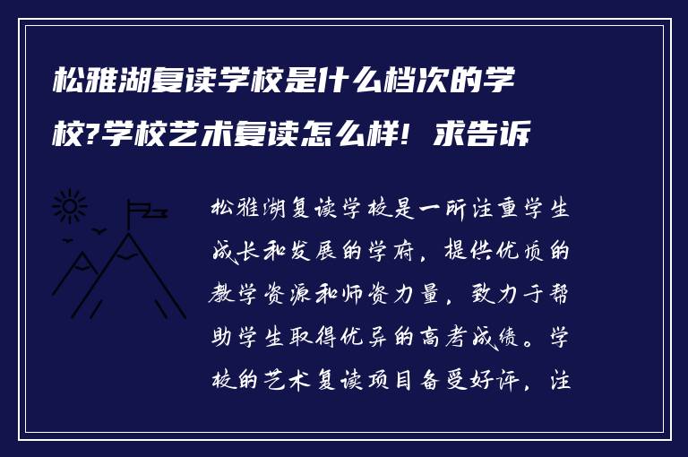 松雅湖复读学校,位于风景优美的松雅湖畔,是一所备受关注的学府。那么,松雅湖复读学校究竟是什么档次的学校呢?学校的艺术复读又是怎样的呢?让我们一起来探秘。