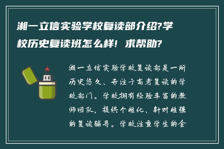 本文/问答《湘一立信实验学校复读部介绍?学校历史复读班怎么样! 求帮助?》由湖南长沙复读网www.chengkaohui.com收集整理,网友“借一盏月色”分享提供,如有内容不符,或者其它建议可以联系咨询15274855379(微信同号)