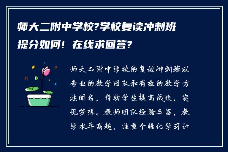 对于许多学生来说,复读冲刺班是提高成绩的重要途径之一。师大二附中学校的复读冲刺班以其专业的教学团队和有效的教学方法闻名于校内外。